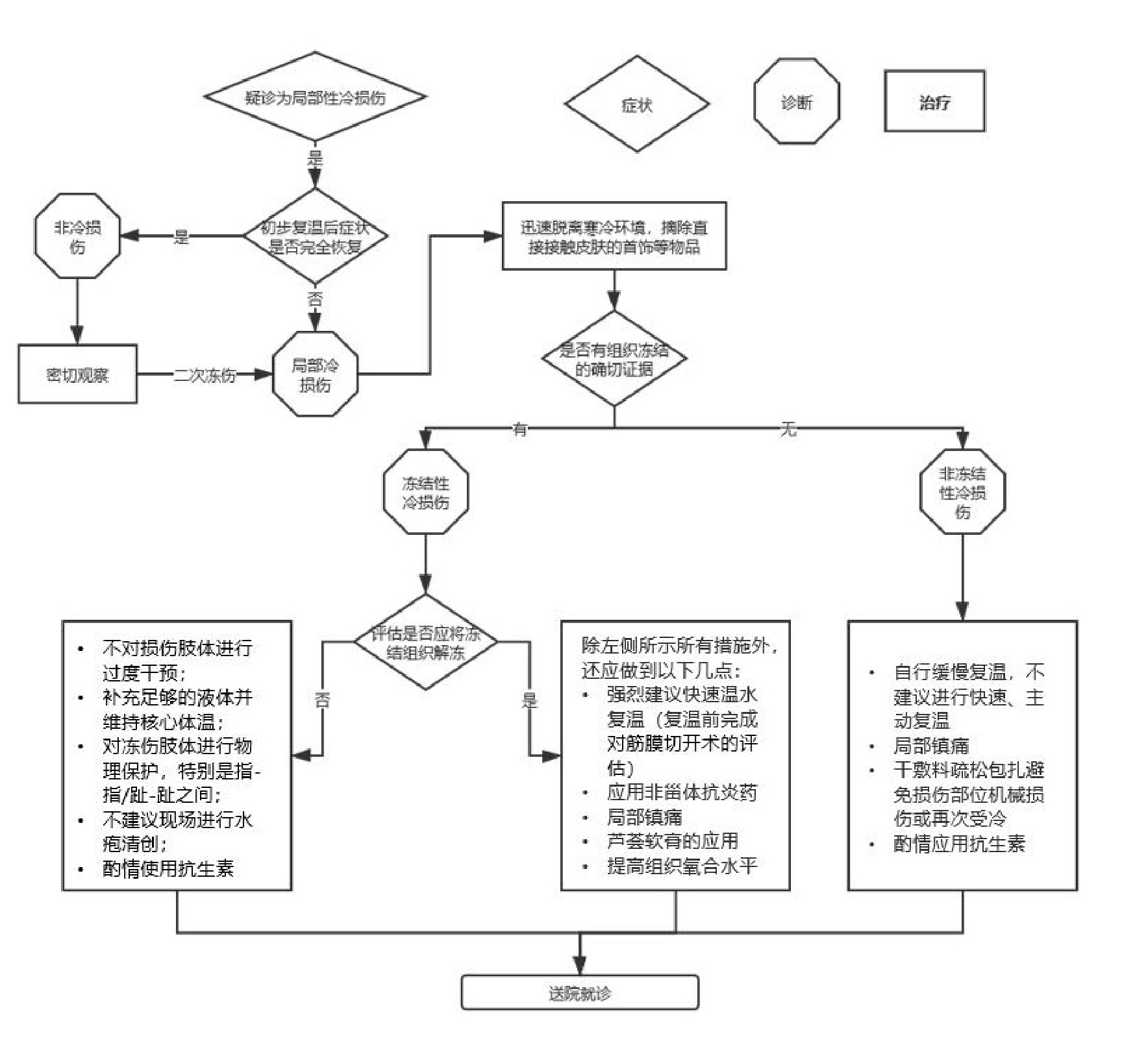 应注意的是,在院前救治中,没有组织冻结确切证据的情况下,所有局部性冷损伤均应按NFCI处理(推荐等级: 1C)。冷损伤的救治首先应明确损伤类型。其处理顺序应为全身性冷损伤——(同时或之后)FCI——NFCI(推荐等级: 1C)。这与各类型冷损伤致死率及致残率有关。