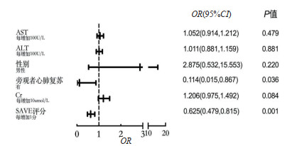 患者临床结局为因变量,将经单因素分析发现两组间差异有统计学意义的指标纳入二分类多因素Logistic回归分析,分类变量予以赋值处理,连续变量以实际数值统计。结果显示,旁观者心肺复苏(OR=0.114, 95% CI:0.015~0.867, P=0.036)和SAVE评分(OR=0.625, 95% CI:0.479~0.815, P=0.001) 是预测ECPR患者ICU死亡的独立危险因素(图 2)。
