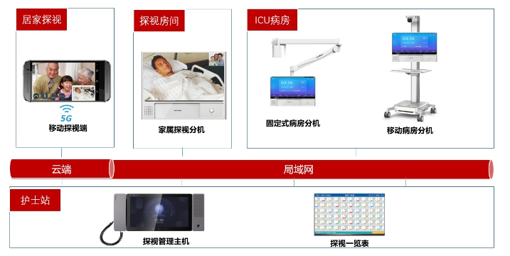 智能探视系统使用海康DS-KMO9803与DS-KMM9503,搭载医护人员身份认证、时间设置、通话监控、录像存储等基础功能,以及5G网络适配、支持移动端多形式对接等系统亮点,可以实现家属到院视频探视与居家远程探视。家属到院探视时,在取得了护士端探视中心的授权后,使用海康DS-KMO9803型号探视分机,通过采集的音频、视频进行编码及压缩,依托5G高速网络传输至探视主机DS-KMM9503端,由平台进行同步的数据接收及解码,可以使病房端与探视端可建立可视双向语音通话;同时护士可通过探视中心与病房端及探视端进行通话,形成三方对接。此外,通过将探视模块搭载至手机应用程序平台,家属可通过手机端进行探视预约,由护士使用探视中心程序进行审核及授权后,可将家属手机端连接病房端进行通话探视,由探视中心对探视进行全程监管。此外,该系统可实现云端存储与视频回放,便于存档资料保存,见图 2。