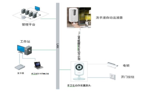 智能化院感防控系统包括智能手卫生识别系统与智能穿戴识别系统,实现医护人员手卫生的监管与个人防护的自动识别。前者对于进入ICU单元的医护人员,采用快速手消毒液出液器TTL开关量信号采集与视频序列识别结合的方式,在医护人员取用快速手消毒液后,由系统采集手卫生动作,通过机器学习的方式对手卫生动作进行分析,手卫生完成步骤与时间达标的前提下,自动开启ICU单元的大门(图 3-4)。智能穿戴识别系统主要由海康威视DS-2TD1217B-3/6/PA视频探头及AI开放平台构成,通过5G CPE Pro无线路由器将视频信号转码上传至云服务器,可通过电脑的海康威视AI开放平台端进行查看与运作。视频片段的预处理采用视频序列与机器学习相结合的技术手段,在AI开放平台中结合机器学习与深度学习系统对医护人员佩戴工作帽、口罩的动态视频进行反复识别与学习训练。当医护人员在目标区域内未按照要求佩戴工作帽、口罩等防护用具时,通过前端摄像采集装置进行图像采集与后台分析,结合5G高速网络处理,系统将在0.2 s内触发报警系统,通过提示音提醒医护人员及时完善防护穿戴。