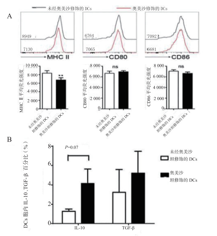 2 结果 2.1 奥美沙坦诱导耐受性DCs的产生及其对DCs胞内细胞因子IL-10和TGF-β的影响采用流式细胞仪检测发现,OLM-DCs较Con-DCs明显低表达MHC Ⅱ(P < 0.05),CD86表达有降低趋势,但差异无统计学意义(图 1A)。通过ELISA测定,OLM-DCs组较Con-DCs组高表达细胞因子IL-10(P = 0.07),两组间TGF-β的表达差异无统计学意义(图 1B)。