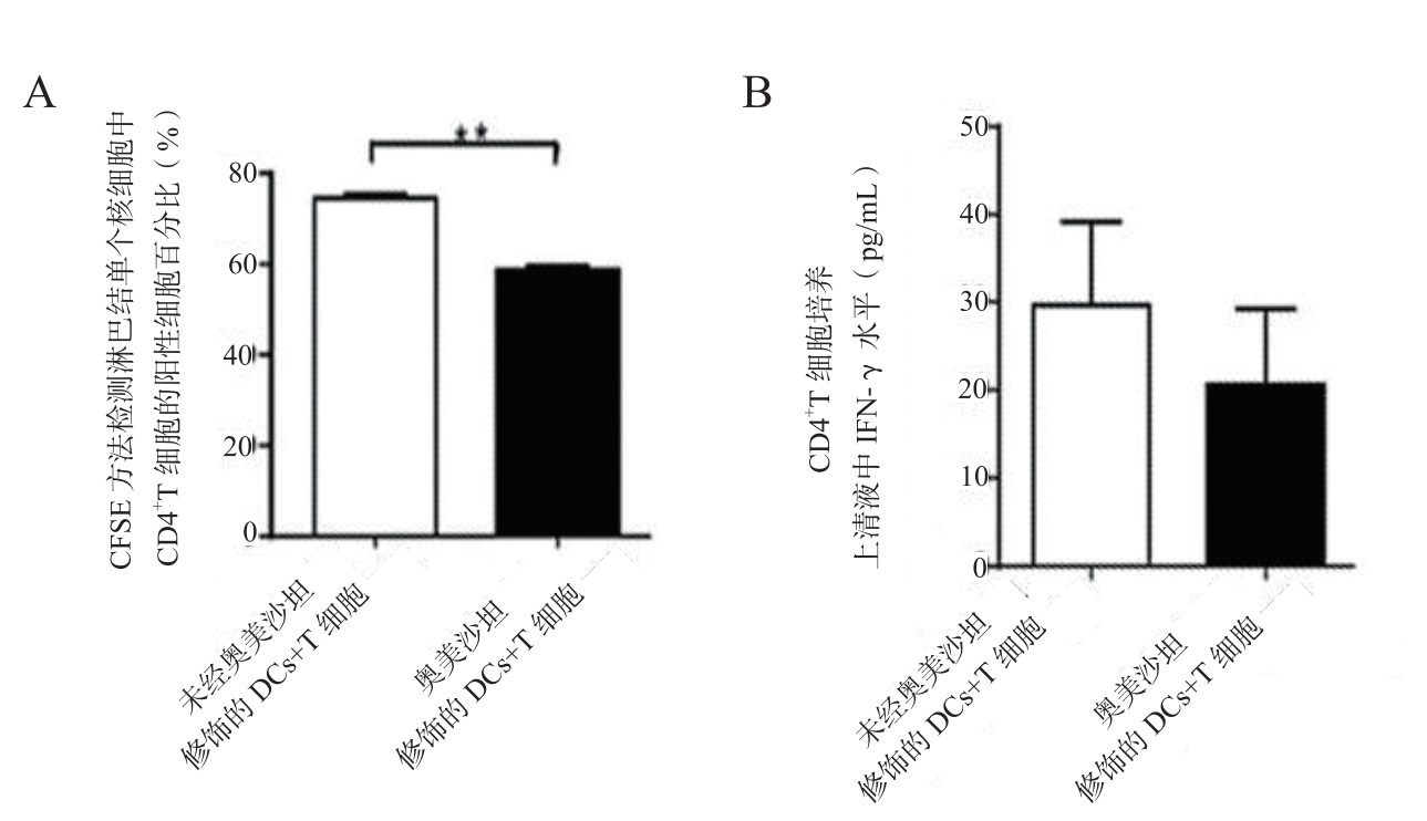 为了验证奥美沙坦对DCs是否具有免疫调控作用,在临床降压的同时是否对AS免疫反应起作用,我们在体外培养DCs,分别经奥美沙坦及其溶剂进行干预。结果发现,在体外奥美沙坦修饰的DCs表面明显低表达MHC Ⅱ、胞内高表达IL-10。这说明奥美沙坦能够诱导耐受性DCs的产生,而耐受性DCs在体外进一步抑制T淋巴细胞增殖和Th1细胞因子的分泌。因此,奥美沙坦作为一种ARBs类降压药物,在降压的同时还具有抗炎作用,为抗AS的预防提供了多靶点保护。