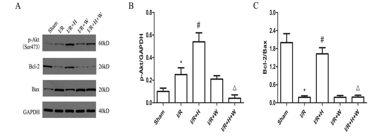 2.3 心肌组织p-Akt(Ser473)、Bcl-2、Bax蛋白的表达与Sham组比较,I/R组p-Akt表达和Bax表达上调,Bcl-2表达下调,Bcl-2/Bax降低(P < 0.05);与I/R组比较,I/R+H组p-Akt及Bcl-2表达上调,Bax表达下调,Bcl-2/Bax升高(P < 0.05);与I/R+H组比较,I/R+H+W组p-Akt表达和Bax表达上调,Bcl-2表达下调,Bcl-2/Bax降低(P < 0.05);而I/R+W组与I/R组相比p-Akt、Bcl-2、Bax表达差异无统计学意义(图 2)。