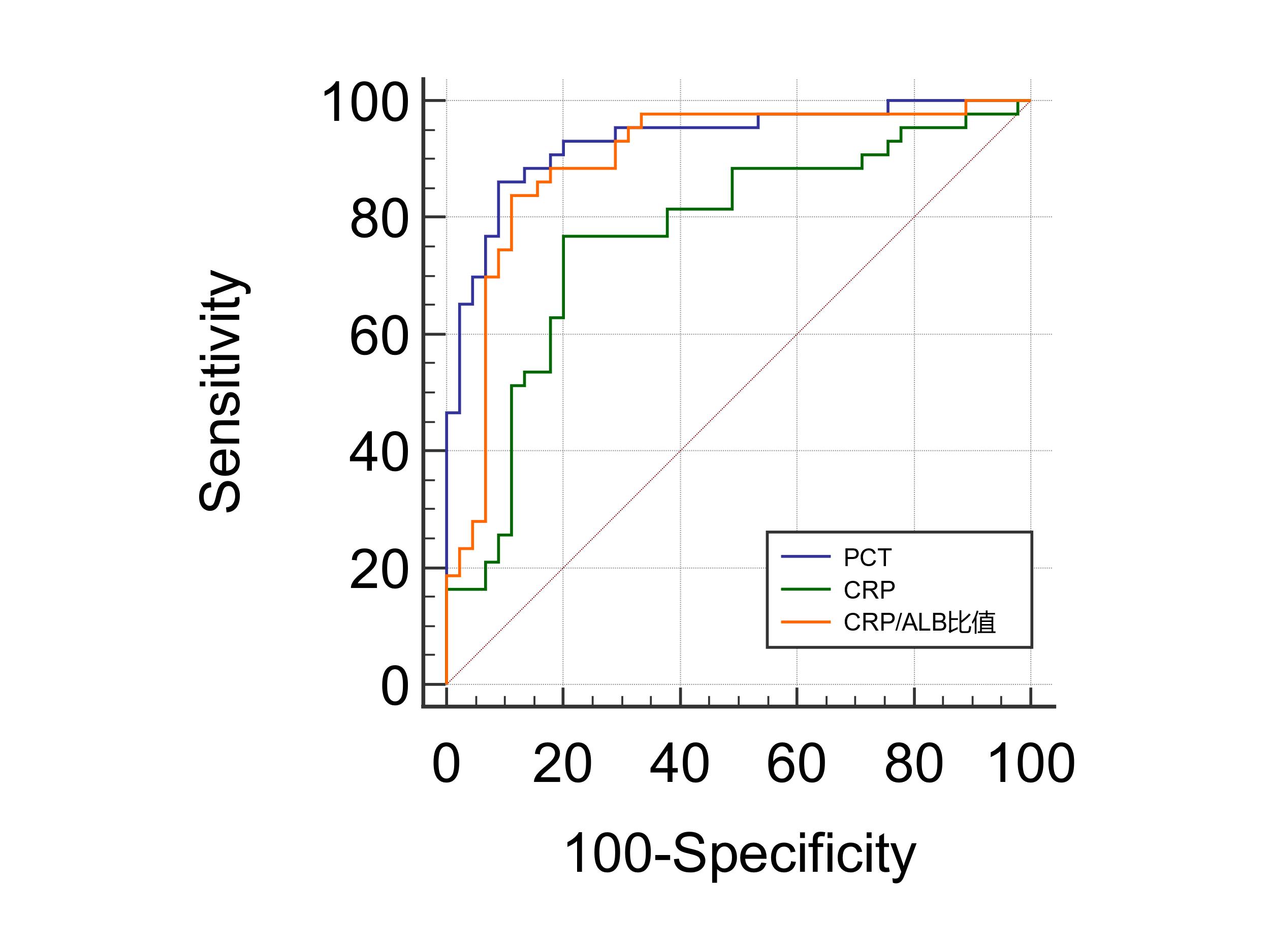 | 注:PCT,降钙素原;CRP,C-反应蛋白;CRP/ALB,C-反应蛋白/白蛋白比值;AUC,曲线下面积;95%CI,95%置信区间 | |||||