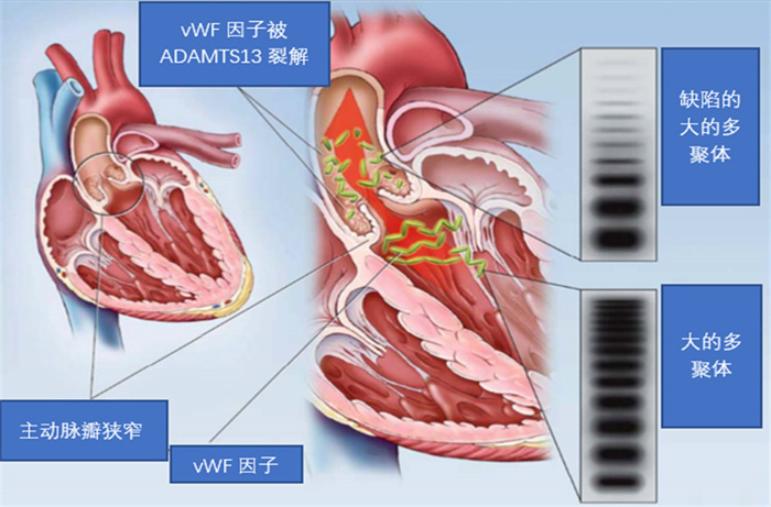 | 图 1 HS患者vWF的高分子量多聚体(high-molecular-weight,HMW)通过狭窄瓣膜时受到高流体剪切应力,易被ADAMTS13蛋白酶裂解为有缺陷的无法有效止血的多聚体 |