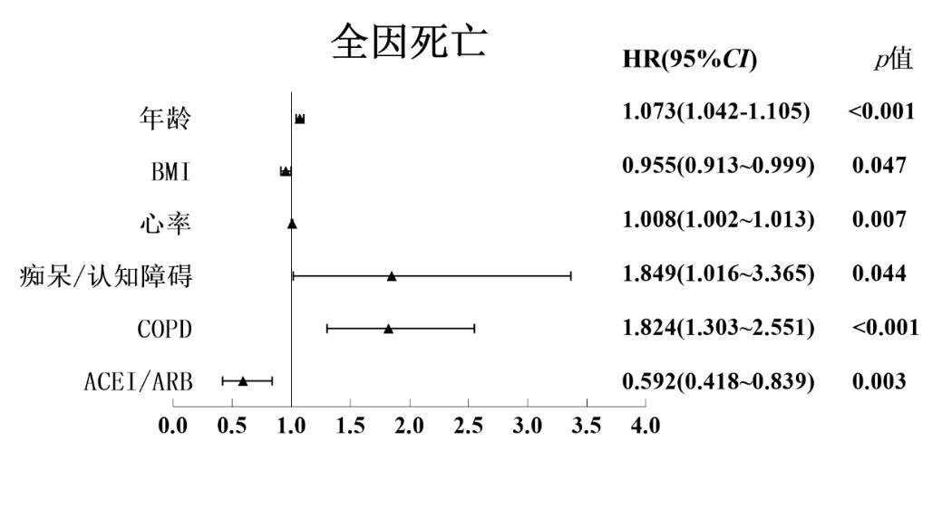 多因素COX回归模型分析结果显示(图 1),年龄(HR 1.073,95%CI 1.042~1.105,P<0.001)、心率(HR 0.955,95%CI 0.913~0.999,P=0.047)、痴呆/认知障碍(HR 1.849,95%CI 1.016~3.365,P=0.044)、COPD(HR 1.824,95%CI 1.303~2.551,P < 0.001)是房颤患者1年全因死亡的独立危险因素; 相比无血管紧张素受体阻滞剂(ARB)/血管紧张素转化酶抑制剂(ACEI)治疗者,ARB/ACEI治疗的患者死亡风险比显著降低(HR 0.592,95%CI 0.418~0.839,P=0.003)。