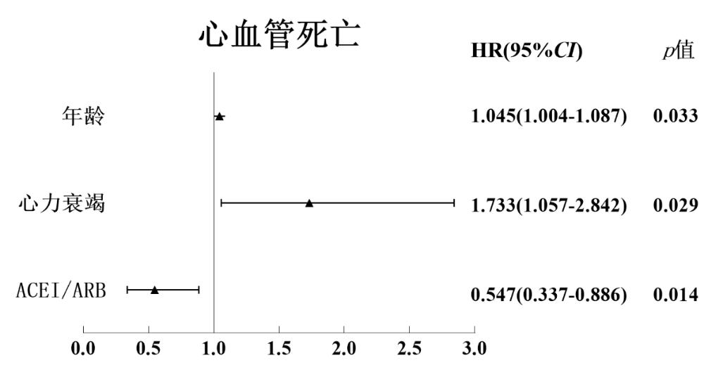 多因素COX回归模型分析显示(图 2),年龄(HR1.045,95%CI 1.004~1.087,P=0.033)、心力衰竭(HR1.733,95%CI 1.057~2.842,P=0.029)为老年房颤患者1年随访心血管死亡的独立危险因素,而相比于无ARB/ACEI治疗的患者,ARB/ACEI治疗的患者的心血管风险亦显著降低(HR 0.547,95%CI 0.337~0.886,P=0.014)。