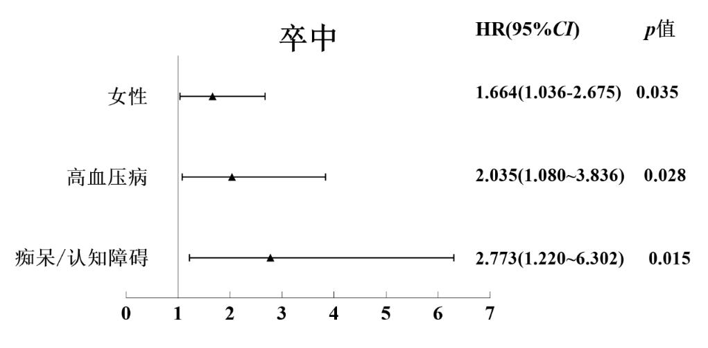 多因素COX回归模型结果显示(图 3),女性(HR1.664,95%CI 1.036~2.675,P<0.035)、高血压病(HR 2.035,95%CI 1.080~3.836,P=0.028)、痴呆/认知障碍(HR 2.773,95%CI 1.220~6.302,P=0.015)为老年房颤患者1年卒中的独立危险因素。