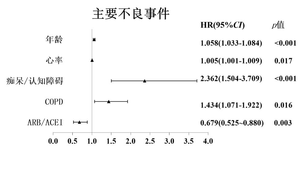 多因素回归模型显示年龄(HR 1.058,95%CI 1.033~1.084,P < 0.001)、心率(HR 1.005,95%CI 1.001~1.009,P=0.017)、痴呆/认知障碍(HR 2.362,95%CI 1.504~3.709,P < 0.001)、COPD(HR 1.434,95%CI 1.071~1.922,P=0.016)为老年房颤患者1年MAE的独立危险因素; 而相比于无ARB/ACEI治疗的患者,应用ARB/ACEI治疗的患者的MAE风险亦显著降低(HR 0.679,95%CI 0.525~0.880,P=0.003),见图 4。
