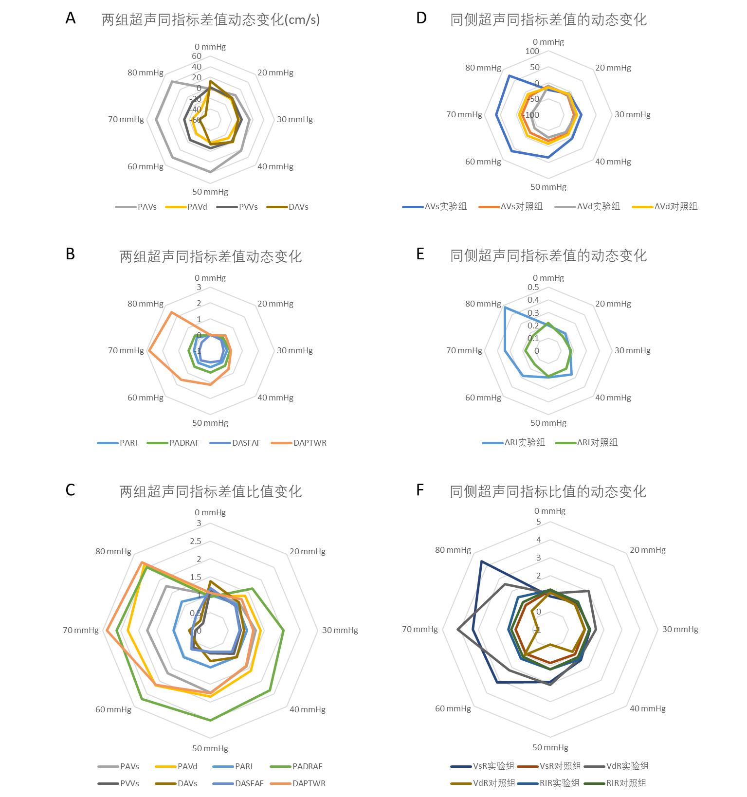 实验组与对照组PAD、PAA、PVD、PVA、DAVd、DARI比值在不同压力时差异无统计学意义(均P > 0.05)。PAVs、PAVd、PARI、PADRAFR、PVVs、DAPTWR两组比值在压力增加时比值逐渐增大(分别F=14.184、21.602、3.548、28.759、8.553、13.096,均P < 0.05),DAVs和DASFAFR实验组与对照组比值加压后比值逐渐减小(分别F=9.64、6.097,均P < 0.05)。