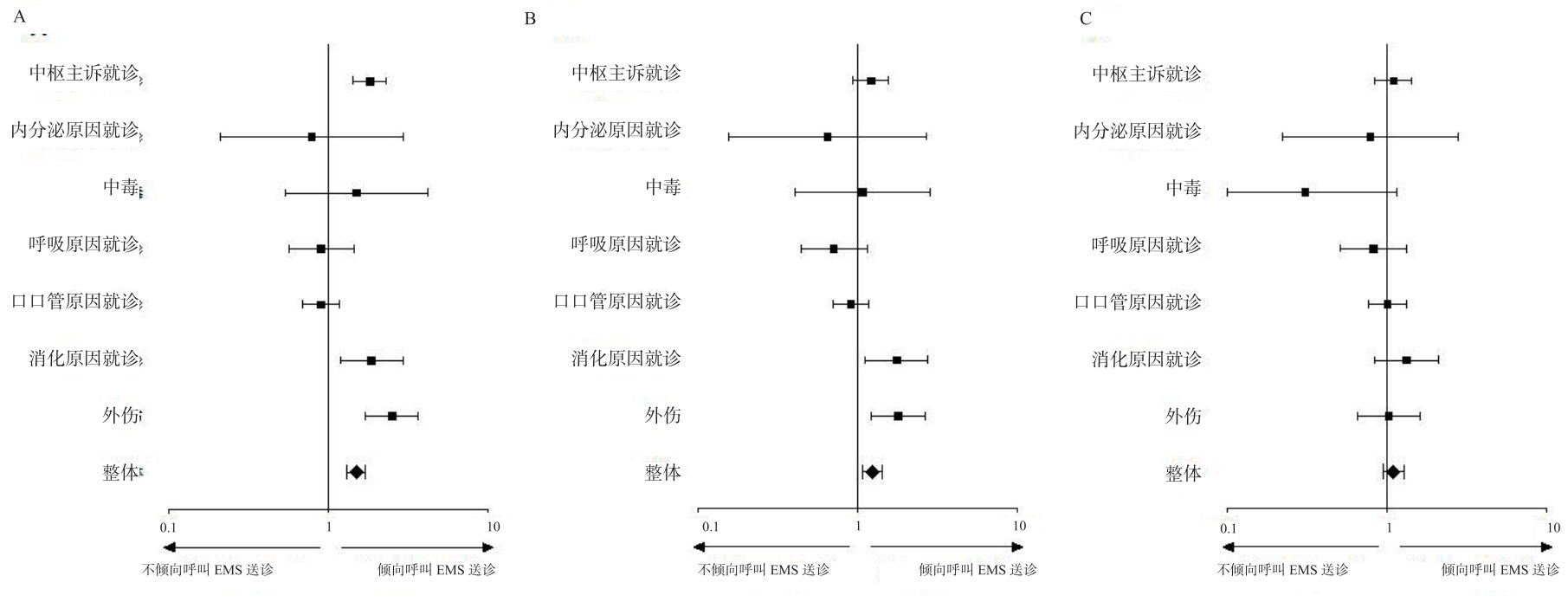 | A: 未使用倾向性评分校正;B:9变量倾向性评分校正模型;C:22变量倾向性评分校正模型 图 2 不同模型中EMS与患者病情危重程度关系 Fig 2 The relationship between the EMS use and severity of patients in different models |
