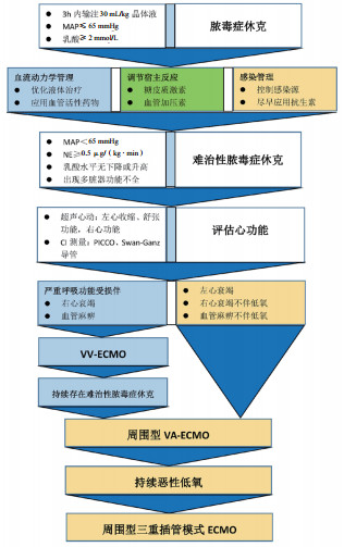 5 体外膜肺氧合治疗脓毒症休克的流程ECMO治疗成人脓毒症休克流程,见图 1。实际临床工作中,SS患者进行充分的液体复苏、应用血管活性药物[甲肾上腺素 > 1 μg/(kg·min),或相当剂量的血管活性药物]以及呼吸支持后仍存在低血压伴有终末脏器衰竭,尤其是病情进行性恶化时,应考虑进行ECMO支持。在此之前,应通过超声心动图评估患者的双心室功能。若严重呼吸功能受损致低氧血症、高碳酸血症合并右心功能不全或血管麻痹而导致血流动力学不稳,可选择VV模式;若进行VV-ECMO支持纠正缺氧后仍存在难治性休克,应及时更换为VA模式或VAV模式。若为右心功能不全或血管麻痹不伴严重低氧血症、或左心功能不全时,可选择VA模式。VA-ECMO支持患者一旦出现南北综合征,应考虑转换为三重插管模式,即VVA或VAV模式。