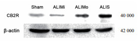 | 注:CB2RmRNA多组间比较采用Welch's分析,两组间比较采用Games-Howell检验,CB2蛋白多组间比较采用单因素方差分析,两组间比较采用LSD检验,与sham组比较,aP < 0.05;与ALIMi组比较,bP < 0.05;与ALIMo组比较,cP < 0.05 | ||