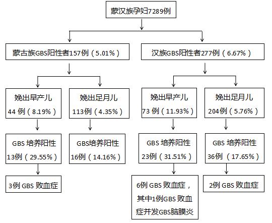 B族链球菌(group B streptococcus,GBS)是寄生于人类下消化道及泌尿生殖道的一种β溶血性链球菌,又称为无乳链球菌[1-2]。孕妇GBS定植可导致胎膜早破、绒毛膜羊膜炎和早产等不良妊娠结局,新生儿感染GBS则会发生GBS肺炎、败血症和化脓性脑膜炎等感染性疾病[2],因此GBS是引起围生期严重感染性疾病甚至死亡的主要致病菌之一,且GBS带菌率因人种及地域的不同而有差异[3]。据报道,新生儿侵袭性GBS感染的总病死率在足月儿中约为1%~8.4%,在早产儿中则高达5%~20%[4-5]。鉴于新生儿GBS感染及败血症发病率、病死率及致残率均较高,而当前临床对于孕妇围产期GBS定植情况尚不够重视,且本院是全区危重产妇及新生儿救治中心,就诊量持续居于自治区前列,与本地区患者总数成正比,因此,本研究拟基于少数民族特性[6-7],通过分析蒙汉族孕妇GBS带菌状况及其与新生儿感染及败血症的相关性,探讨该地区GBS感染的相关危险因素,以期丰富少数民族诊疗数据库,为临床诊疗提供借鉴。