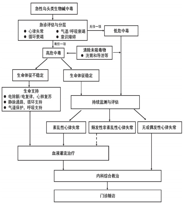 | 图 2 急性乌头类生物碱中毒患者急诊诊疗流程 |