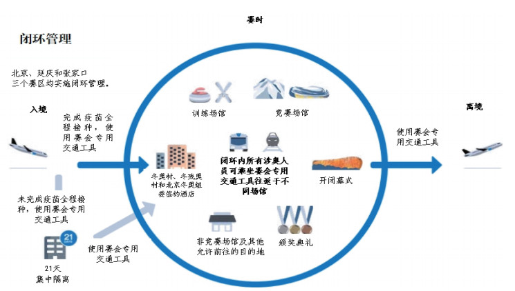 1 闭环管理闭环管理是北京冬奥会的一种特殊管理方法,根据涉奥相关人员的参赛或工作需要,规划出来的固定空间和行动轨迹,以减少不必要的接触、且与城市层面分割开来的一个封闭层面[1]。该层面既能满足运动员的比赛训练需求,也能满足各利益相关方在赛事期间的必要工作,同时保证生活与紧急救治不受影响。北京冬奥会的闭环管理政策涵盖所有涉奥相关人员抵离、住宿、交通、竞赛、训练、医疗救治、餐饮、安保、开闭幕式等所有环节。北京冬奥会所有涉奥相关人员均实行全流程、全封闭、点对点闭环管理。只能乘坐专用车辆往返指定场所(包括场馆和酒店等),不能前往闭环外的任何地点,以确保与闭环外社会公众或各类人员无任何接触。进入到冬奥会场馆,按区域划分、运动员流线与观众和其他人群流线分离的原则,所有场馆工作空间实施单向交通,确保运动员流线不会与其他人群交叉,北京冬奥会闭环管理示意图见图 1。