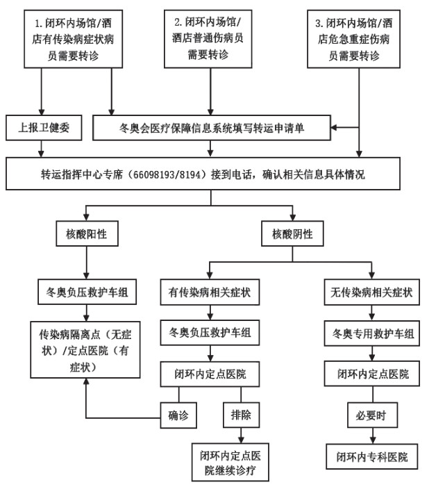 除场馆和酒店的现场救治外,安全快捷转运至定点医疗机构进行救治也是冬奥会急救服务工作的重要内容。为确保涉冬奥伤病员得到高水平的医疗救治,北京18家定点医院发挥优势、突出特色,按急诊与重症、运动医学、骨科、神经外科、内科、心血管科、口腔科、康复、中医、感染性疾病、心理等具体专业实施精准分类收治。同时,根据专业特点和地理位置,定点医院还被分为闭环内普通伤病员定点医院、闭环内专科医院、闭环内传染病症状定点医院、闭环外传染病症状定点医院、闭环外普通伤病员定点医院五大类。此外,为提供救治效果,还配置了10名院士、60名市级专家给予技术支持。