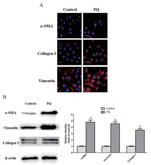 A:免疫荧光分析对照组和PQ组细胞α-SMA、Vimentin和Collagen I的表达水平(×600);B:Western Blot检测α-SMA、Vimentin和Collagen I的表达水平,Image J测定目的条带灰度并比较;aP < 0.05 图 1 PQ处理对MRC-5细胞α-SMA、Vimentin和Collagen I表达水平的影响 Fig 1 Expression of α-SMA、Vimentin and Collagen I in MRC-5 cells treated with PQ |