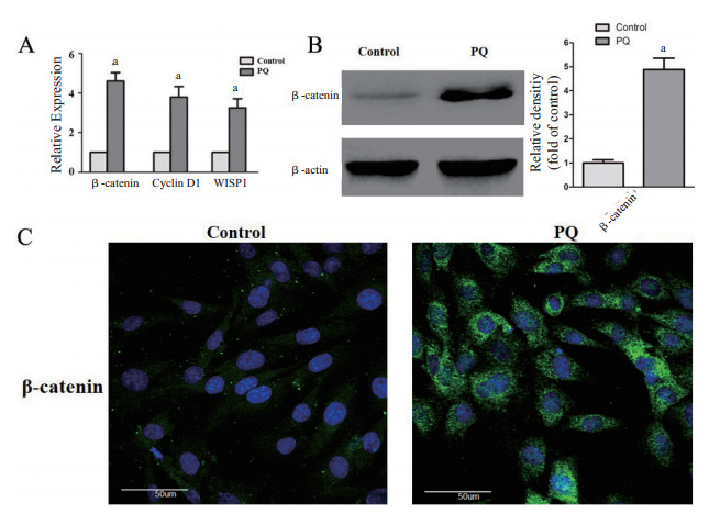 采用PQ(50 μmol/L)处理细胞72 h后,采用RT-PCR检测Wnt通路相关信号分子β-catenin、Cyclin D1和WISP1的mRNA表达水平变化情况,采用Western Blot和免疫荧光技术检测关键信号分子β-catenin的蛋白表达水平变化情况。如图 2A所示,与Control组细胞相比,PQ刺激MRC-5细胞转分化过程中,Wnt通路下游信号分子β-catenin、Cyclin D1和WISP1的mRNA表达水平显著上调(P < 0.05);如图 2B所示,PQ处理3 d后,MRC-5细胞β-catenin蛋白表达水平明显增加(P < 0.05);同时,免疫荧光检测结果也提示PQ组细胞β-catenin的表达水平上调,结果如图 2C所示。