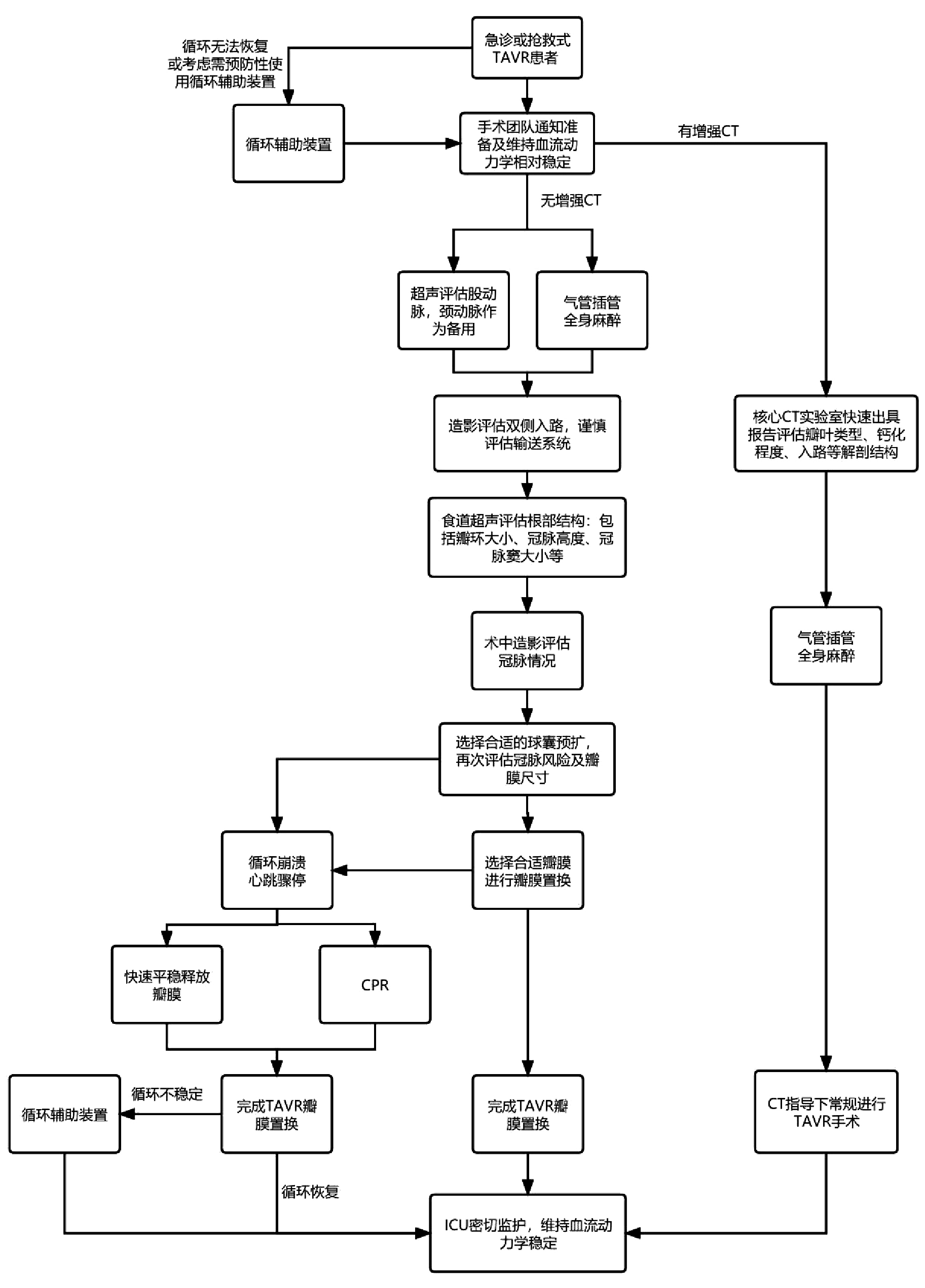 急诊TAVR的患者往往面临着病情危急无法完善增强CT、入路条件评估不全面、冠状动脉情况不明确、瓣膜选择困难等诸多难点,与常规的TAVR手术流程推荐存在一定区别[14],根据本中心的临床实践经验,将急诊TAVR流程分享如图 1。需要注意的是,急诊TAVR作为挽救生命的抢救技术,其适用的患者往往病情极其危重,在术前及手术全程均容易出现血流动力学不稳定及循环崩溃。尽管本研究中仅1例患者使用了循环辅助装置(mechanical circulatory support,MCS),但有研究显示合理地预防性使用循环辅助装置(如IABP、Impella、ECMO等)相较于紧急使用MCS的预后明显改善[7, 15],这提醒急诊TAVR需要重视MCS的使用时机,除了手术开始时需准备好MCS、预留血管通路之外,必要时术前可以预防性使用MCS。