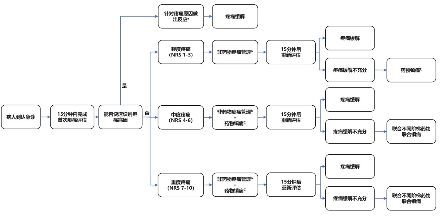 药物用于镇静、镇痛的同时,有可能导致中枢神经系统、呼吸系统、或心脏功能抑制。为了能够充分镇痛且最大限度地减少并发症,选择恰当药物和剂量非常重要,必须在正确的时机予以给药。患者在使用镇静镇痛药物之前,和用药过程中及停药后均需要对患者一般情况进行评估,即程序化管理[16]。首次疼痛评估需要在就诊15 min内完成,疼痛治疗以减少疼痛评分为目标(NRS评分减少50%/低于4分,或降为轻度疼痛)[16]。