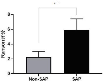 | 与相应对照组比较,aP < 0.01 图 2 SAP组与Non-SAP组入院后首次Ranson评分比较 Fig 2 Comparison of the first Ranson score after admission between the SAP group and non-SAP group |
