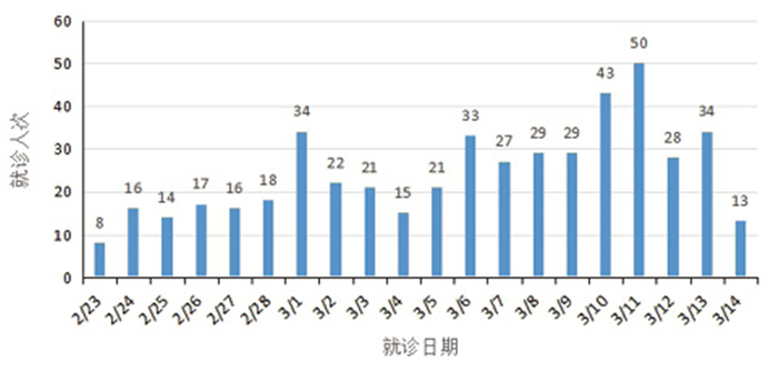 冬奥会期间与冬残奥会期间,上午就诊人次以9-10时最多,其次为10-11时、11-12时;下午就诊人次以16-17时最多,其次为15-16时、17-18时;2-7时均无人员就诊;23-2时,共有7人次就诊。见图 3。
