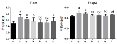 各组大鼠肠黏膜上皮T-bet、Foxp3表达情况见图 3。