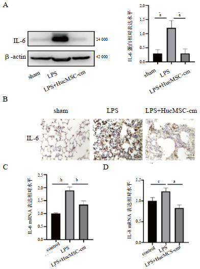 | A:Western Blot检测小鼠肺组织IL-6蛋白表达水平(左)及量化图(右);B:免疫组化检测小鼠肺组织IL-6的表达(放大倍数,×400);C和D:RT-PCR检测肺微血管内皮血细胞IL-6及IL-8 mRNA表达水平;aP < 0.01,bP < 0.001,cP < 0.05 图 2 HucMSC-cm能减少LPS诱导的ALI肺组织中IL-6 Fig 2 HucMSC-cm reduced IL-6 in LPS-induced ALI lung tissue |