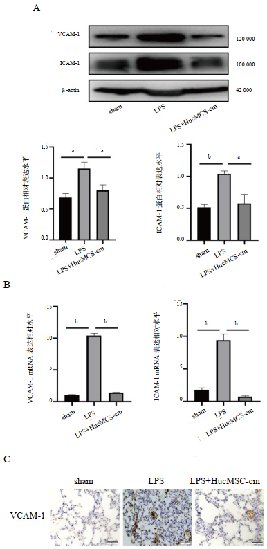 进一步探究HucMSC-cm在体内对肺微血管内皮细胞粘附分子的影响。结果发现LPS组ICAM-1(P < 0.001)及VCAM-1(P=0.001)蛋白水平较sham组高,而在HucMSC-cm预处理组,ICAM-1(P=0.001)及VCAM-1(P=0.006)蛋白水平明显下降(图 3A);mRNA水平上结果相同(P < 0.001)(图 3B)。此外,免疫组织化学也证明LPS组VCAM-1的阳性表达较sham组高,并且主要聚集于肺血管周围,而LPS+HucMSC-cm组能有效抑制VCAM-1的表达(图 3C)。