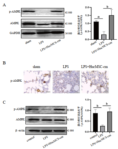 既往研究发现AMPK的活化可以改善ALI[13],本研究检测ALI模型中p-AMPK及AMPK蛋白水平,发现LPS组中p-AMPK蛋白水平较sham组降低(P=0.013),而AMPK蛋白水平未见明显改变;在治疗组中,HucMSC-cm可以改善p-AMPK的表达(P=0.002),而并未改变AMPK蛋白水平(图 4A)。此外,通过免疫组化方法亦得到与前述相似的结果,并且p-AMPK的表达主要分布于血管周围(图 4B)。在体外实验中,用HucMSC-cm及LPS处理肺微血管内皮细胞,得到了与体内一致的结果,即LPS组中p-AMPK蛋白水平降低(P=0.005),而HucMSC-cm可以改善p-AMPK的表达(P=0.003)(图 4C)。因此,HucMSC-cm可以通过激活肺微血管内皮细胞AMPK磷酸化水平缓解LPS诱导的ALI。