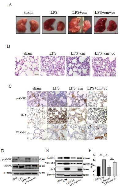 本研究利用LPS诱导的小鼠ALI模型证明HucMSC-cm在ALI中的保护作用,发现HucMSC-cm可以减少LPS诱导的肺组织中ICAM-1、VCAM-1及IL-6的表达,并且证实AMPK在该过程中的重要作用。