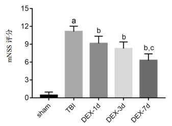 2 结果 2.1 DEX降低TBI大鼠mNSS评分TBI组各时间点mNSS评分显著高于sham组(P < 0.05);与TBI组相比,DEX治疗时间依赖性地降低mNSS评分,差异有统计学意义(P < 0.05)。见图 1。