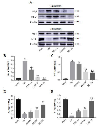 与sham组相比,TBI组MG M1标记物(IL-1β、TNF-α)表达明显升高(P < 0.05,图 3A~C),M2标记物(Arg-1、IL-10)表达明显降低(P < 0.05,图 3D、E);与TBI组相比,DEX治疗降低TNF-α和IL-1β表达,促进Arg-1和IL-10表达,其中,以DEX-7 d组的改变最显著,差异具有统计学意义(F值分别为180.60、120.60、55.88、108.80,P < 0.05)。