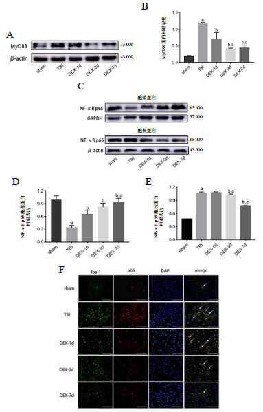 | A:MyD88蛋白质免疫印迹条带图;B:MyD88蛋白相对定量统计;C:NF-κB p65胞浆胞核蛋白质免疫印迹条带图;D、E:NF-κB p65胞浆胞核蛋白相对定量统计;F:各组损伤皮质免疫荧光双标,Iba-1显示绿色荧光标记,NF-κB p65显示红色荧光标记,细胞核显示蓝色荧光标记,比例尺=100 μm;与sham组比较,aP < 0.05;与TBI组比较,bP < 0.05;与DEX-1d组比较,cP < 0.05;n=3/组 图 4 DEX抑制NF-κB p65核易位调节MyD88/NF-κB通路 Fig 4 DEX regulates the MyD88/NF-κB pathway by inhibiting the nuclear translocation of NF-κB p65 |