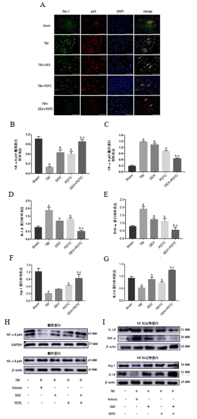 | A:各组损伤皮质免疫荧光双标结果;B、C:NF-κB p65胞浆胞核蛋白相对定量统计;D~G:各标记蛋白相对定量统计;H:NF-κB p65胞浆胞核蛋白质印迹条带图;I:M1、M2标记蛋白质印迹条带图;与sham组比较,aP < 0.05;与TBI组比较,bP < 0.05;与DEX组比较,cP < 0.05;n=3/组 图 5 PDTC对NF-κB通路的影响 Fig 5 The effect of PDTC on NF-κB pathway |