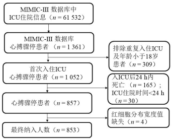 红细胞分布宽度(red cell distribution width, RDW)是衡量外周血红细胞体积异质性的参数,通常结合其他指标用于血液系统疾病识别和诊断[8]。除此之外,RDW作为一种新型潜在不良预后的预测因子,在重症患者的预后方面发挥着重要作用,如脓毒症、急性呼吸窘迫综合征、急性胰腺炎及脑出血等疾病[9-12]。但是,目前RDW对CA患者不良预后预测的相关研究有限,值得进一步探讨。本研究基于美国重症监护医学信息数据库(MIMIC-Ⅲ, v1.4),探讨RDW在预测CA患者预后结局的临床意义。