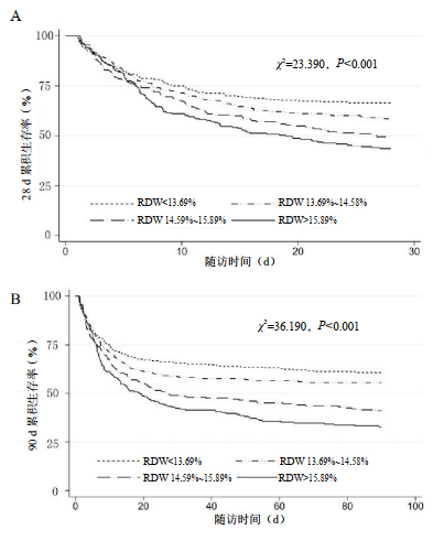 RDW:红细胞分布宽度 图 2 28 d(A)和90 d (B)累计生存率Kaplan-Meier生存曲线 Fig 2 Kaplan–Meier curves of 28-day (A) and 90-day (B) cumulative survival rate |