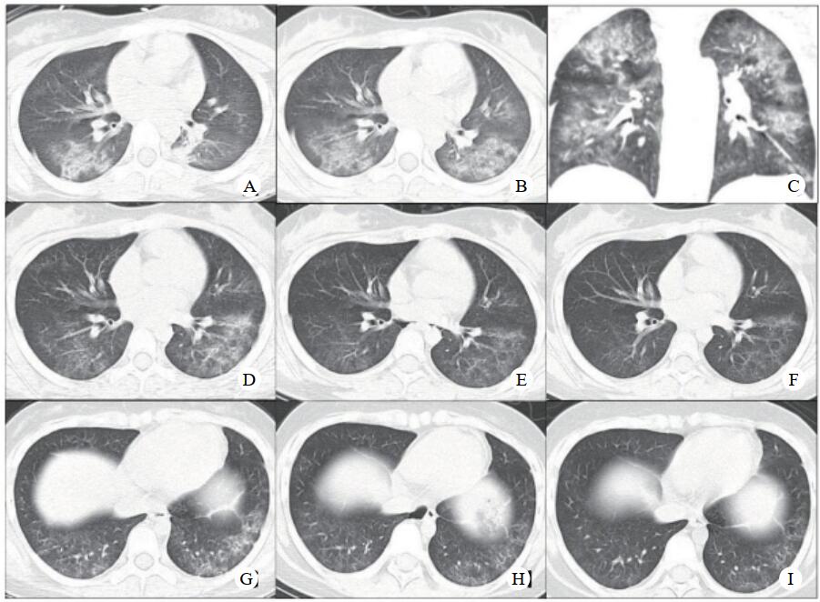 | A~F分别为第一至五次CT同一层面的影像表现,第一次CT(A)主要表现为斑片状渗出灶和磨玻璃影,第二次CT(B和C)示渗出灶更明显,后三次CT可见渗出灶及磨玻璃影吸收、消散;G-I分别为第三至五次CT,第三次CT(G)示双肺下叶背侧胸膜下可见磨玻璃影之上的网格影及胸膜下线影,提示出现间质纤维化改变;第四次CT(H)示双肺背侧明显的间质纤维化改变;第五次CT(I)选择与前一次CT同一层冠状面,示间质纤维化较前一次CT明显减轻 图 1 一位12岁男患儿吸入性肺损伤后CT图像的动态演变过程 |