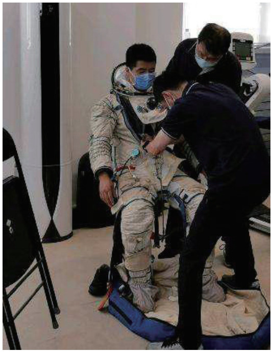 图 2 模拟航天员穿脱航天服演练 Fig 2 Simulate astronauts to exercise wearing and taking off spacesuits |