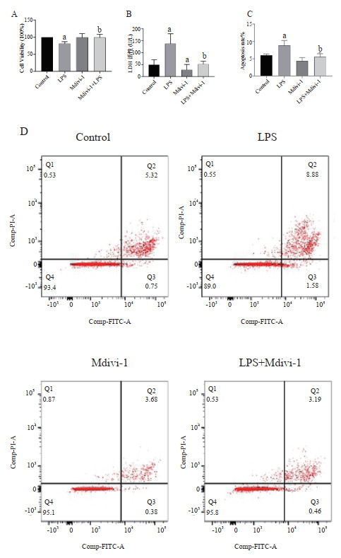 1 材料与方法 1.1 材料H9C2大鼠心肌细胞系(上海中乔新舟);DMEM高糖培养基、胰酶、青霉素/链霉素双抗(Gibco,美国);胎牛血清(上海双洳公司),线粒体分裂抑制剂(mitochondrial division inhibitor 1,Mdivi-1,Selleck,美国);LPS(Sigma,美国);二甲基亚砜(北京鼎国昌盛);CCK-8试剂盒(MCE,美国);乳酸脱氢酶(LDH)检测试剂盒(南京建成);线粒体膜电位检测试剂盒、活性氧(ROS)检测试剂盒(北京索莱宝);细胞凋亡检测试剂盒(BD Pharmingen,美国);RNA提取试剂盒(上海碧云天);引物(上海生工);SYBR(QIANGIN,德国);总蛋白提取试剂盒(上海贝博);BCA蛋白含量检测试剂盒(江苏凯基生物);动态相关蛋白1(dynamin related protein 1,Drp1)、视神经萎缩蛋白1(Optic Atrophy 1,Opa1)、线粒体融合蛋白2 (Mitofusin2,Mfn2)抗体,MitoTracker Green(CST,美国);GAPDH抗体(北京中杉金桥)。