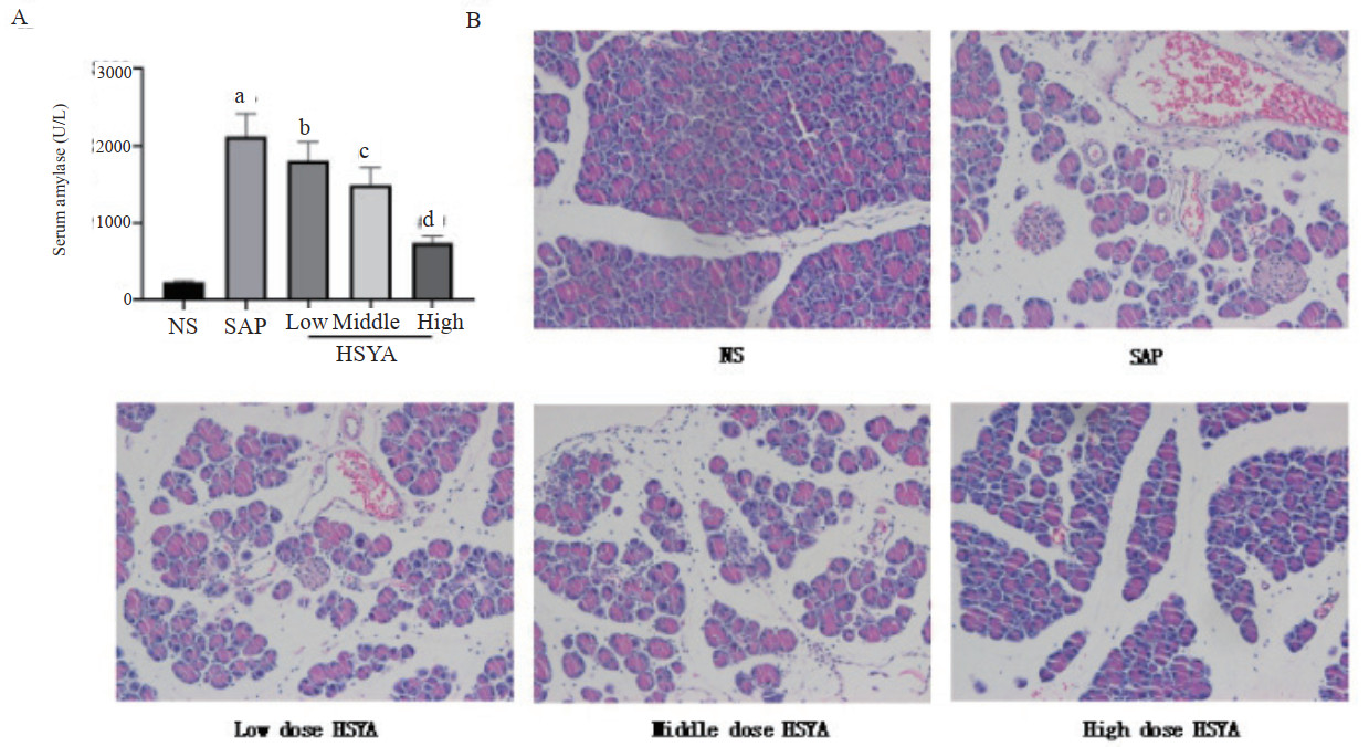 2 结果 2.1 胰腺生化及胰腺组织病理变化采用ELISA法检测血清淀粉酶在不同组别的变化。如表 1和图 1A所示,与生理盐水对照组(NS)相比,SAP组血清淀粉酶活性显著增高,而采用HSYA处理可以降低淀粉酶活性,且呈现浓度梯度性,各组差异均有统计意义(P < 0.05)。光学显微镜观察胰腺组织病理学显示,SAP小鼠胰腺组织出现显著水肿、出血、坏死以及炎性细胞浸润(图 1B)。HSYA处理后可以明显减轻组织病理损伤(图 1B)。