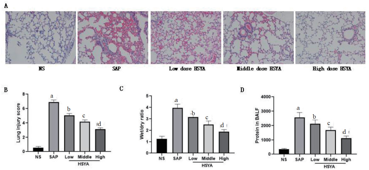 采用HE染色分析不同组别小鼠肺部病理学变化。结果显示,与NS组相比,SAP引起显著肺水肿、炎性细胞浸润和间质出血(图 2A)。HSYA处理可以减轻肺组织的病理损伤,肺组织病理评分显示HSYA对肺部损伤的改善作用呈现浓度梯度性(图 2B和表 2)。此外,与对照组小鼠相比,SAP诱导的ALI小鼠中肺湿/干比(图 2C和表 2)和BALF蛋白浓度(图 2D和表 2)显著增加。然而,HSYA处理以剂量依赖性方式显著降低ALI诱导肺水肿和BALF中蛋白浓度。