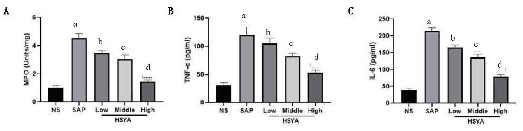与NS组相比,SAP显著增加肺MPO活性,而HSYA处理的小鼠中肺部MPO活性显著降低(图 3A和表 3)。此外,ELISA法测定不同组别BALF中炎症因子浓度。和NS相比,SAP显著增加BALF中TNF-α和IL-6浓度,而HSYA可以抑制上述炎症因子表达水平(图 3B-D和表 3)。
