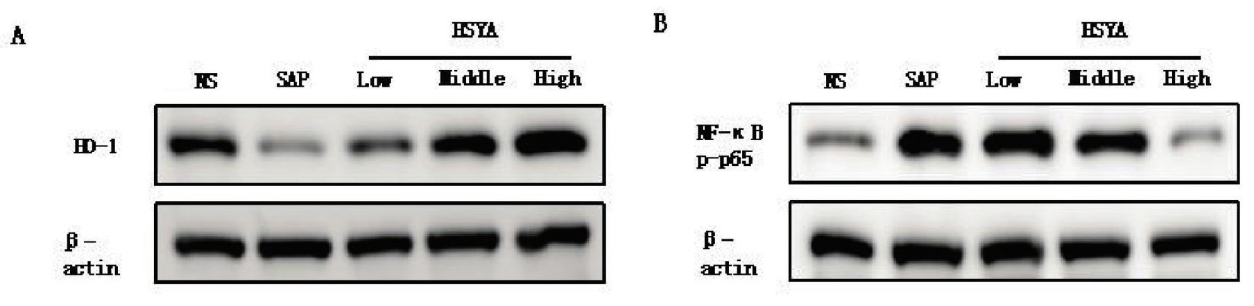 血红素氧合酶1(Heme Oxygenase-1,HO-1)主要催化血红素分解代谢成亚铁、一氧化碳和胆绿素,是一种重要的抗氧化酶。一方面,血红素基团的降解有利于阻止其促氧化作用。另一方面,副产物胆绿素及其还原型胆红素具有有效的ROS清除活性,以抵御过氧化物、过氧亚硝酸盐、羟基和超氧化物自由基[22]。有研究发现,HO-1的过表达能够改善急性重症胰腺炎的肝脏病变及肝肾功能[23]。本研究分析了SAP小鼠肺组织中HO-1的表达情况。结果显示,HSYA处理可以显著增加肺组织HO-1蛋白表达水平,从而发挥抗氧化和抗炎作用。