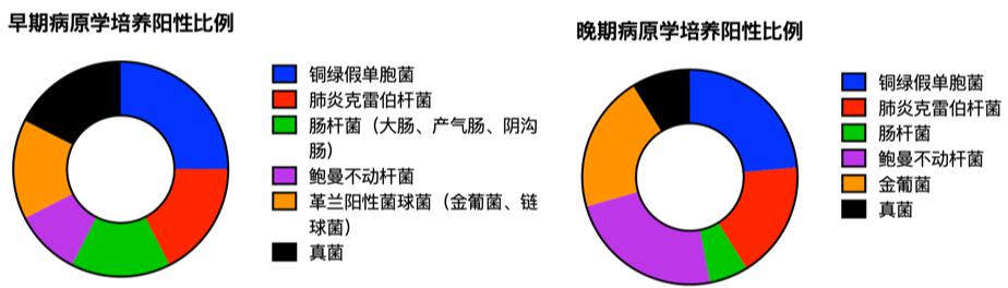1.2.5 病原学结果早期(3 d以内)及晚期(4~7 d)病原学阳性数量、格兰阴性杆菌、阳性球菌、真菌占送检患者比例。
