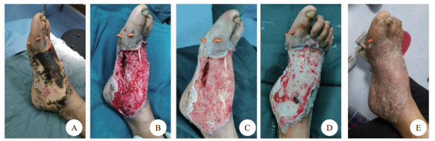 2.1 典型病例1患者男性,58岁,因“机动车碾压致右足皮肤发黑坏死12 d”由急诊科转入本科。患者无基础性疾病史。查体见患者右足肿胀明显,足前内侧皮肤及足底部分皮肤发黑坏死(图 1A),足趾血运尚可,皮温略高。伤后15 d,第一次手术探查发现,右足背及足底皮肤脱套伤,皮下大量坏死组织及陈旧性血凝块,第1~3足趾背伸肌腱部分外露(图 1B),仔细清除坏死组织及不良组织,行负压引流术治疗。伤后19 d再次手术探查,见创面基底肉芽生长尚可,坏死组织少(图 1C),遂行脱细胞真皮支架移植术,继续负压治疗。伤后23 d更换一次负压。伤后29 d,即真皮支架植入后第10天,见真皮支架与伤口基底贴附良好,真皮基质网孔内可见新鲜肉芽组织充填(图 1D),遂从头皮取刃厚皮片打孔后移植覆盖创面,外用负压材料覆盖,一周后打开负压装置,刃厚皮成活良好。两月后门诊复查,见右足创面愈合良好,平整,瘢痕增生不明显(图 1E)。