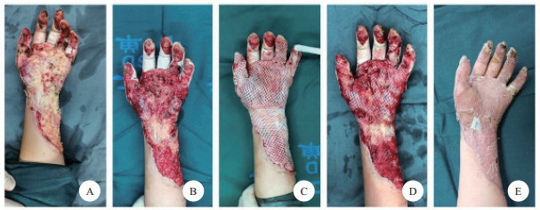患者中年女性,因“左上肢卷入热机器致局部破溃流血4 d”由当地医院转入本院。入院后第4天,行左上肢切痂手术,切痂范围包括左手掌侧、腕部前侧及部分前臂组织,深达深筋膜层(图 2A),创面行负压治疗。入院第11天,大部分创面基底肉芽尚可(图 2B),腕管部少量腱性组织外露,仔细清除可疑坏死组织后,外用脱细胞真皮基质拉网覆盖(图 2C)。负压治疗2周后,检视创面见绝大部分脱细胞真皮基质贴附良好,网眼内肉芽组织丰富。手腕处部分真皮基质肉芽组织生长不佳,与下方组织分离(图 2D),予以清除该部分脱细胞真皮支架及下方腱性组织。自患者同侧大腿取刃厚皮打孔后移植覆盖创面。术后3周随访,愈合区皮肤较为平整(图 2E)。待进一步功能康复和随访。