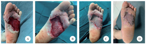 患者男性,51岁,因“铲车伤及左足致足底皮肤发黑坏死16 d”由本院骨科转烧伤科治疗。查体见患者足底中部偏外侧片状皮肤逆行撕脱后发黑坏死,与周围正常皮肤界限基本清晰。伤后第21天和26天分别行局部扩创手术,去除坏死组织,创面负压治疗。伤后30 d,创面基底肉芽组织丰富,无明显坏死组织(图 3A),遂行脱细胞真皮支架复合头皮刃厚皮一步法移植,覆盖创面(图 3B、C)。术后第9天植皮基本成活,术后1个月随访,植皮处创面较为平整,瘢痕增生不明显。(图 3D)。