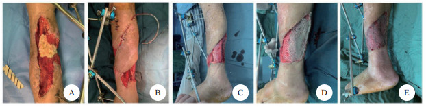 患者,男性,47岁,因“车祸伤致双下肢多处骨折”收住本院骨科。因左小腿开放性骨折,大段胫骨外露合并骨髓炎于伤后40 d转本科行扩创手术,除去部分死骨,空腔处以万古霉素/骨水泥填充(图 4A)。伤后46 d,以小腿外侧筋膜皮瓣转移覆盖骨缺损部位(图 4B),伤后54 d,剩余创面基底肉芽生长尚可(图 4C),行大孔脱细胞真皮基质联合网状刃厚皮移植覆盖创面(图 4D),行负压治疗。伤后60 d,创面植皮成活良好(图 4E)。